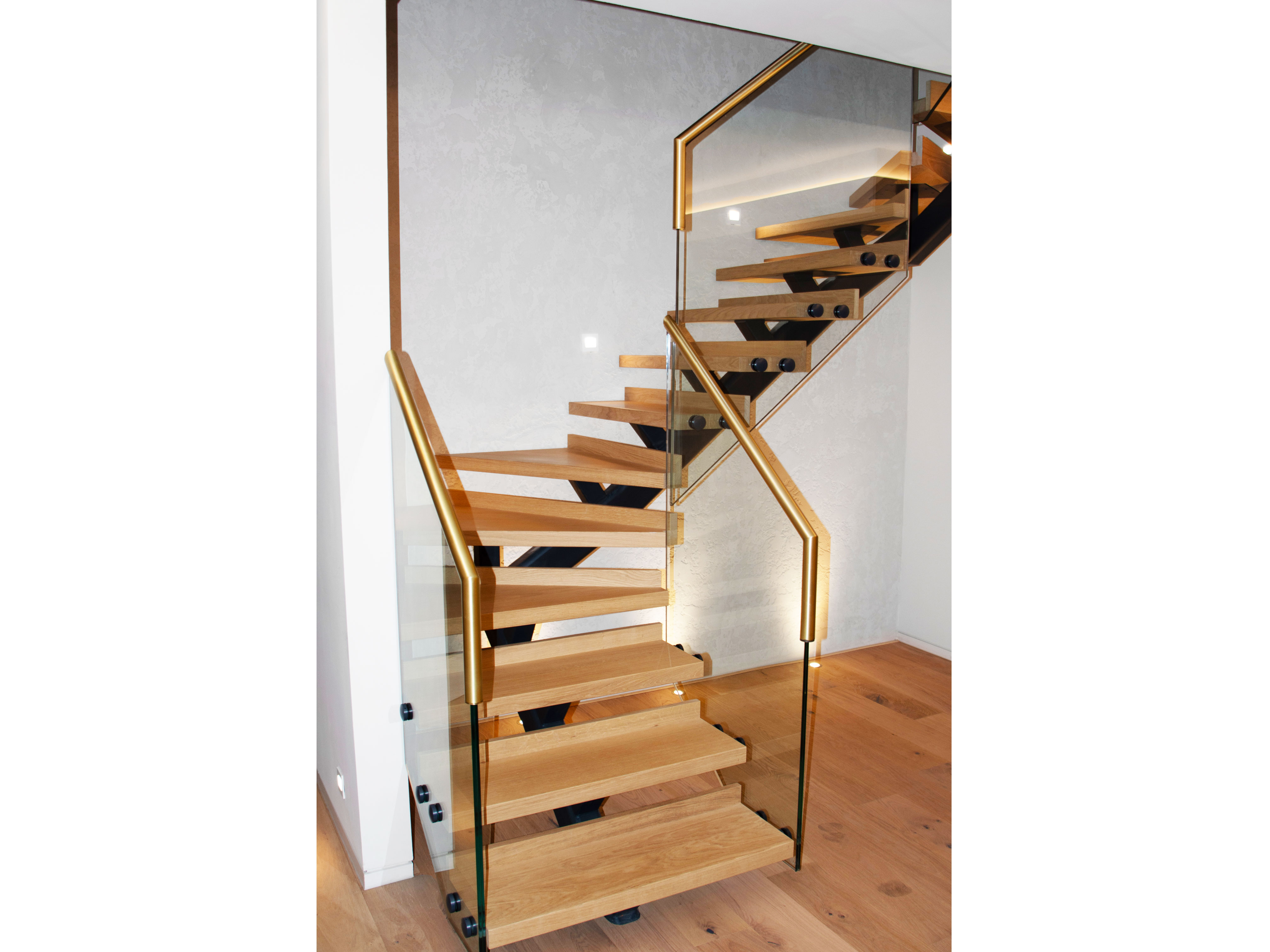 Powder coated mild steel single spine staircase with oak treads, glass balustrade and electro-plated brass handrail.