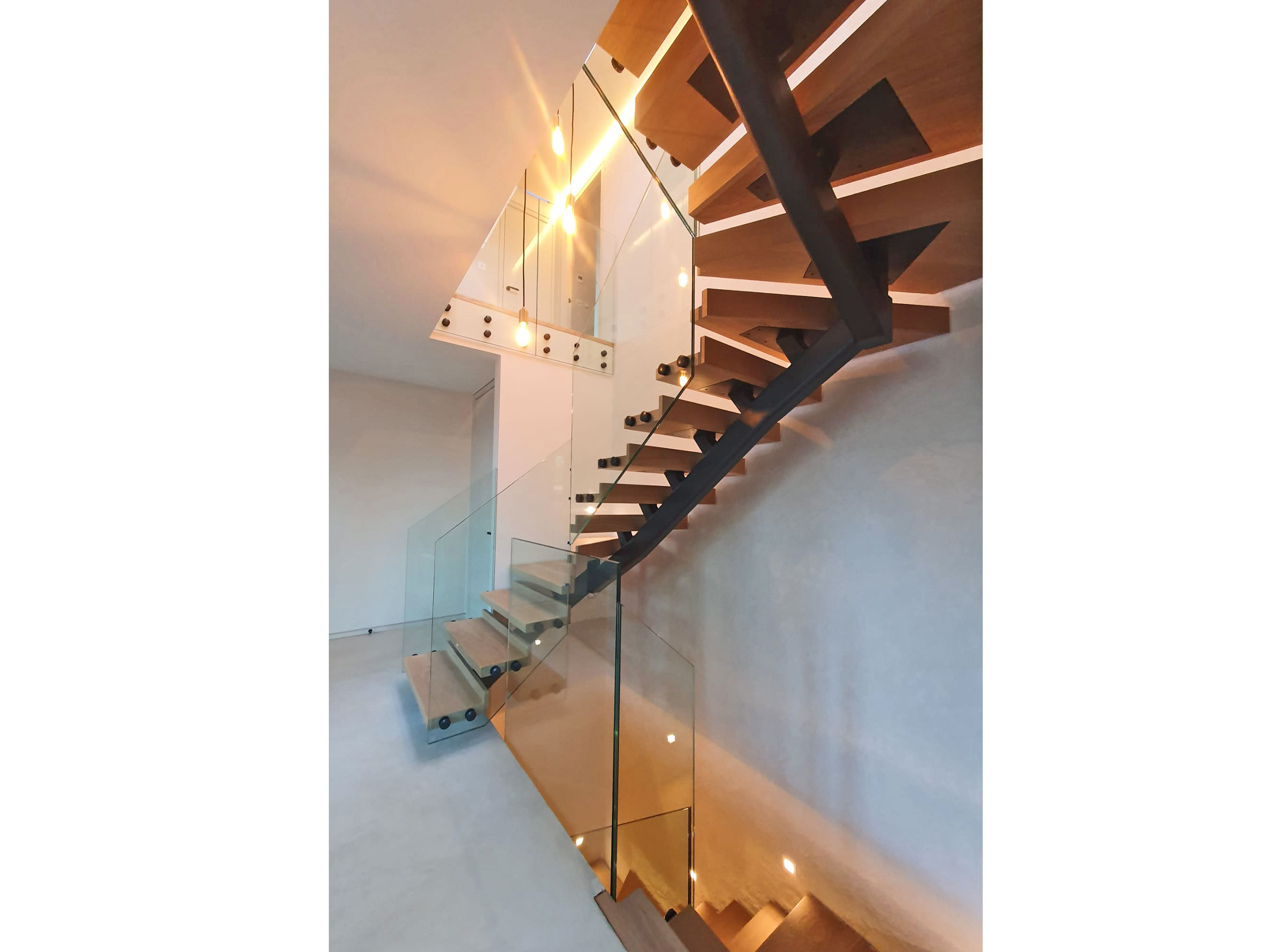We offer a full turnkey service that can include the design, manufacture and installation from a range of materials such as powder coated mild steel, stainless steel and brass, including timber treads such as oak with pencil rounded edges, finished with osmo oil.
