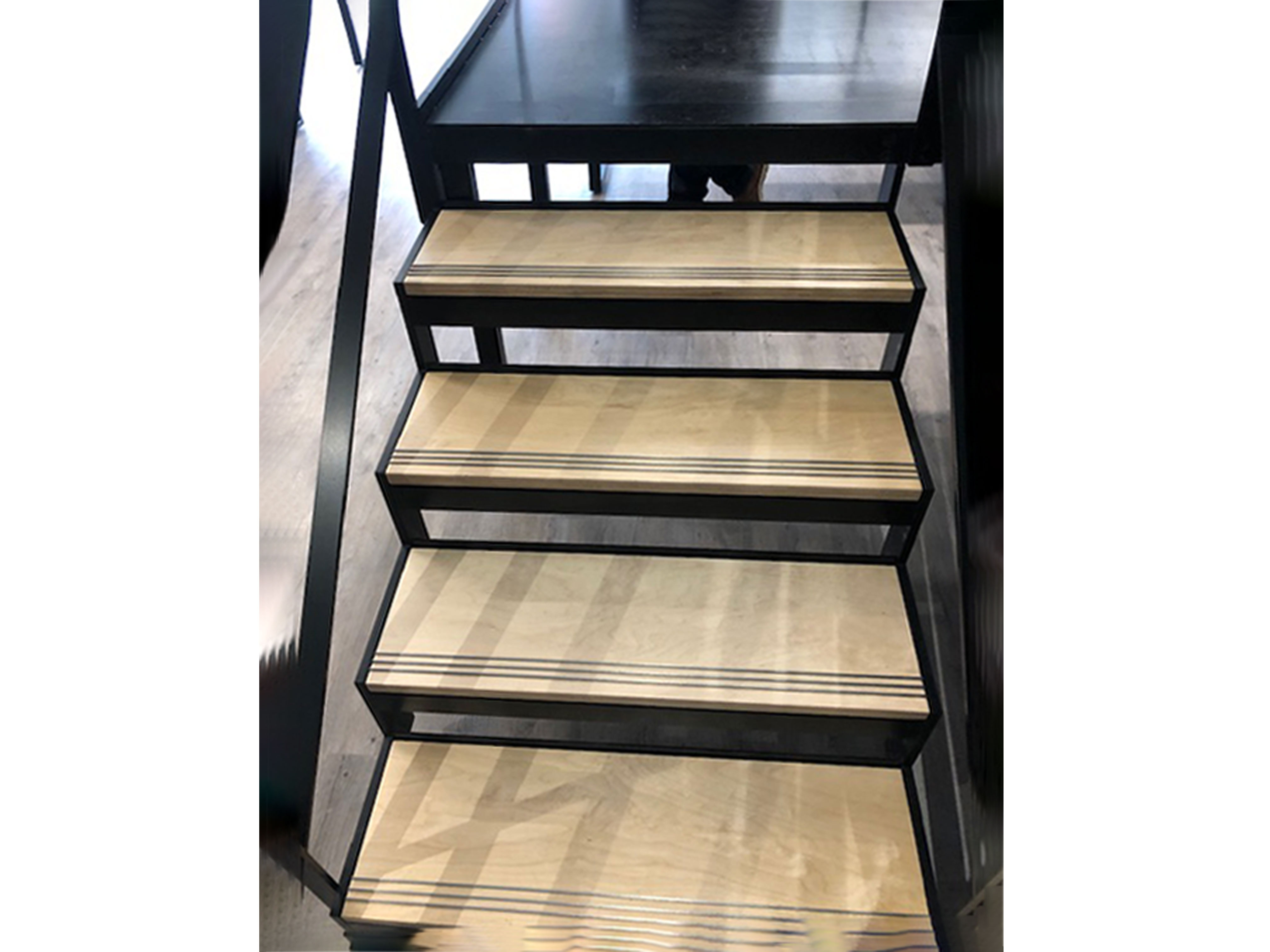Powder coated mild steel semi-industrial staircase, satin polished stainless steel handrail with oak treads and stainless steel inlays.
