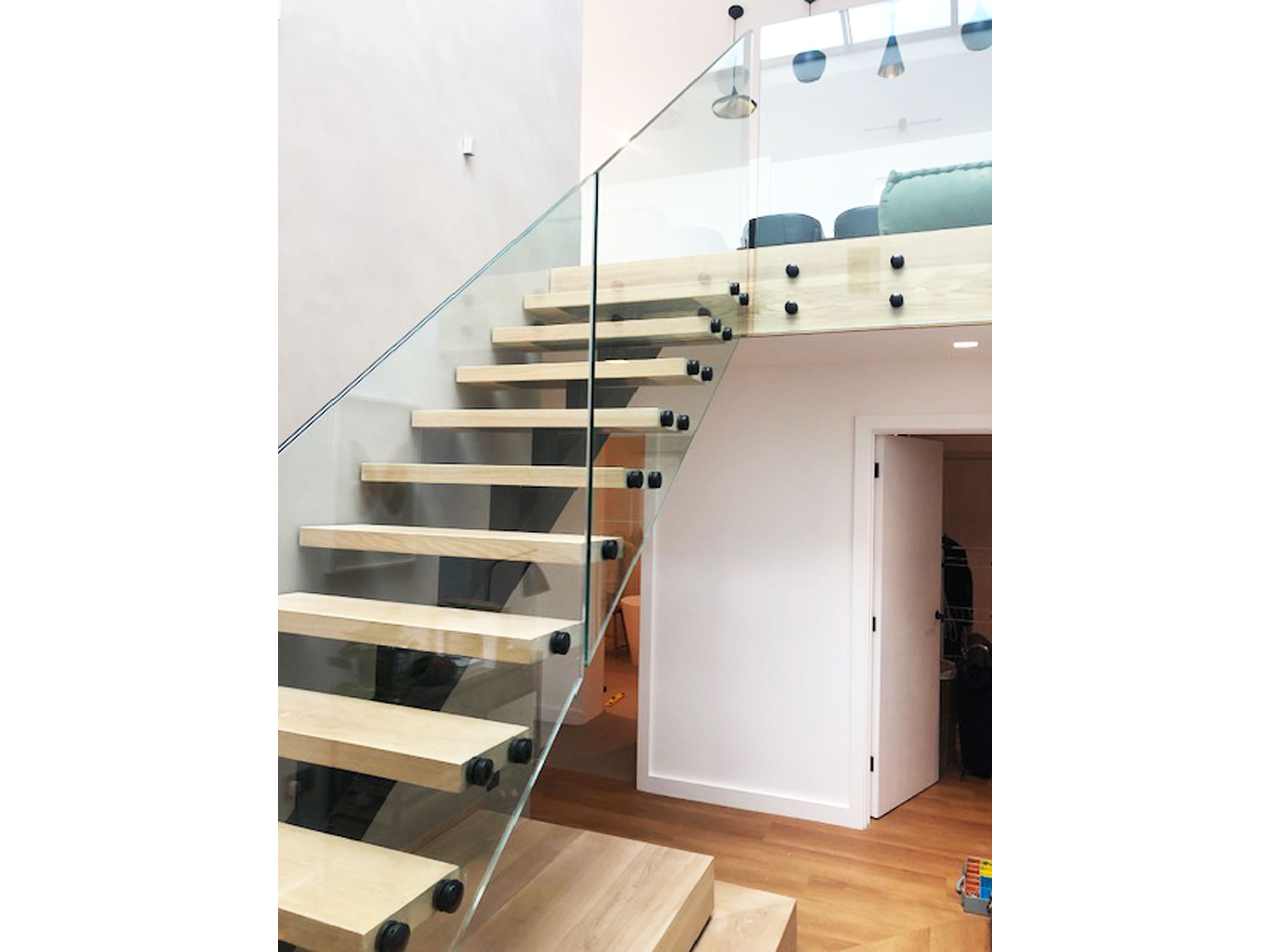 Powder coated mild steel single spine staircase with oak treadsand glass balustrade.